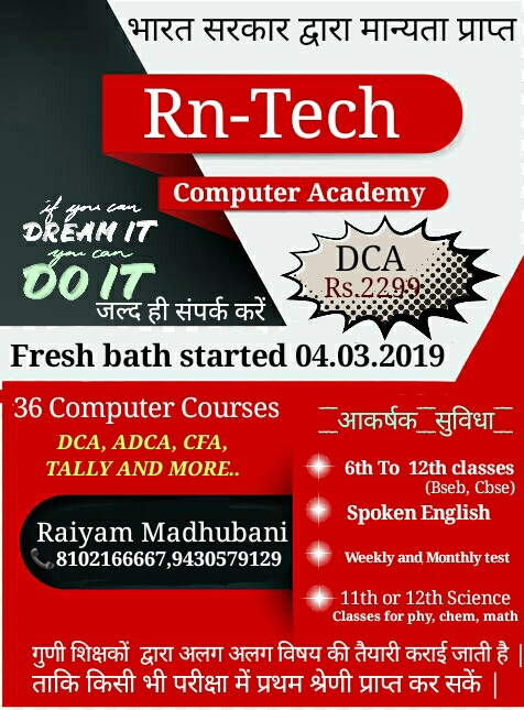 आप सीखकर अपना भविष्य उज्वल कर सकते है मधुबनी जिला के मशहूर कंप्यूटर एकेडमी जो रैयाम मै उपस्थित है सभी स्टूडेंट्स से अनुरोध है कि आप जरूर एक बार कंप्यूटर एकेडमी में आने की कोशिश करें।